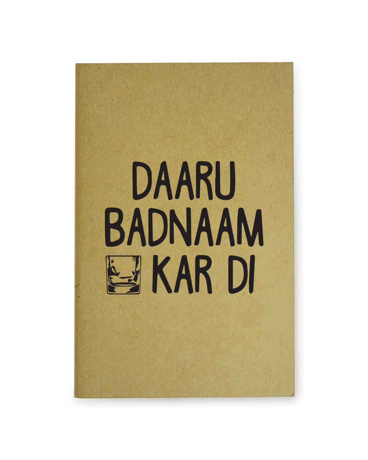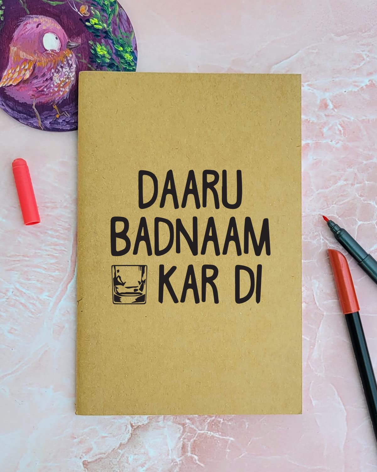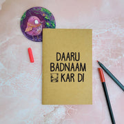 Daaru Badnam Kar Di - Brown A5 Doodle Notebook - Kraft Cover Notebook - A5 - 300 GSM Kraft Cover - Handmade - Unruled - 80 Pages - Natural Shade Pages 120 GSM - Funny Quotes & Quirky, Funky designs