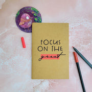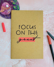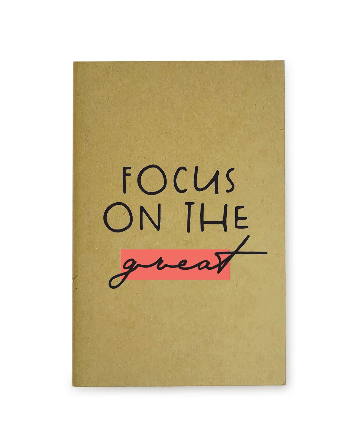 Focus On The Great - Brown A5 Doodle Notebook - Kraft Cover Notebook - A5-300 GSM Kraft Cover - Handmade - Unruled - 80 Pages - Natural Shade Pages 120 GSM - Funny Quotes & Quirky, Funky designs