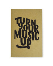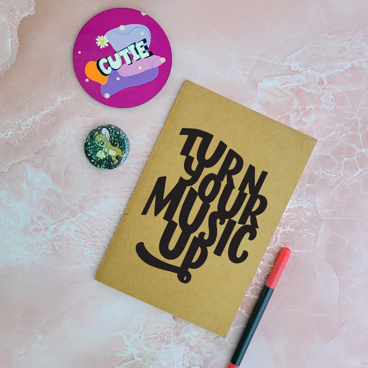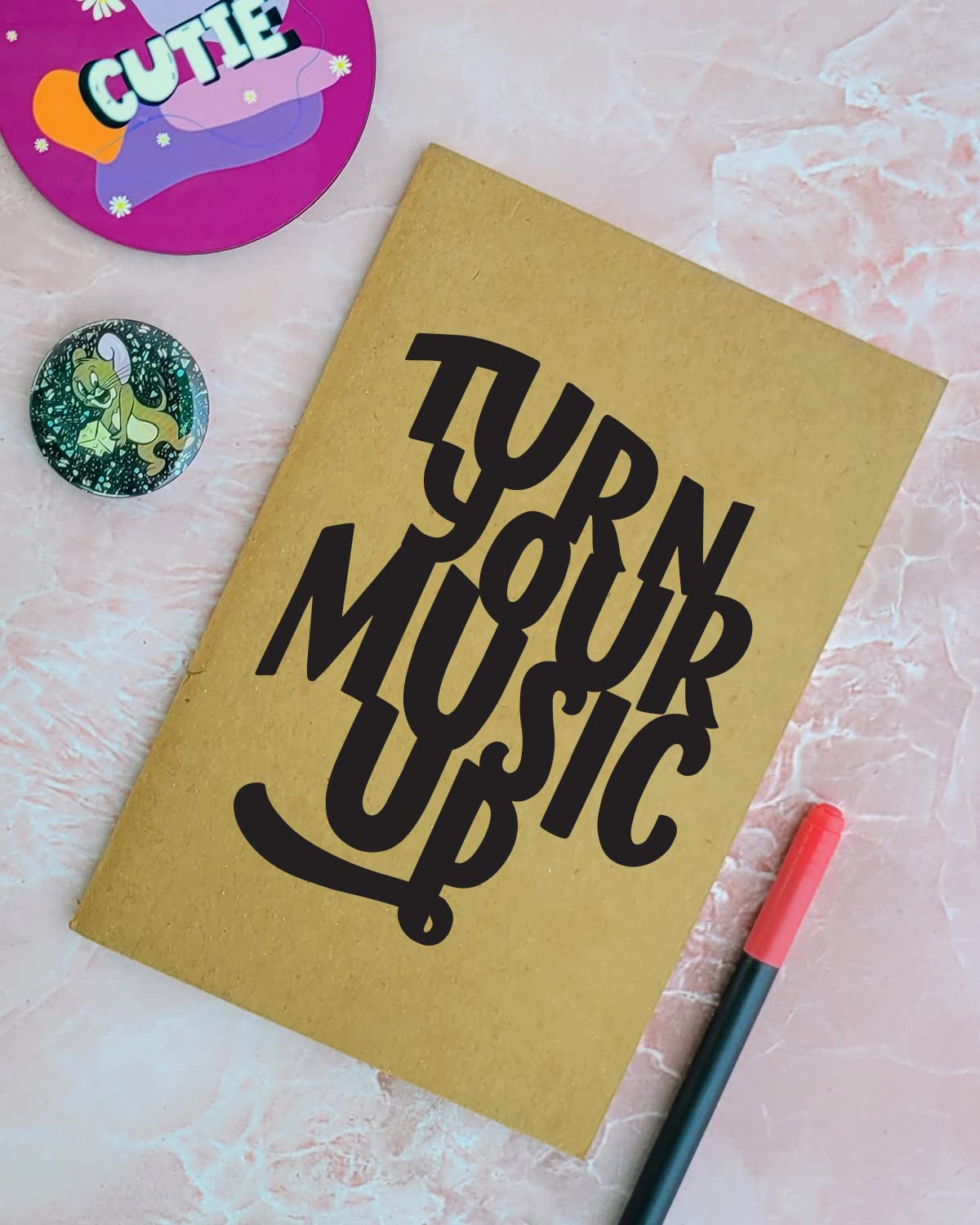 Turn Your Music Up - Brown A5 Doodle Notebook - Kraft Cover Notebook - A5 - 300 GSM Kraft Cover - Handmade - Unruled - 80 Pages - Natural Shade Pages 120 GSM - Funny Quotes & Quirky, Funky designs